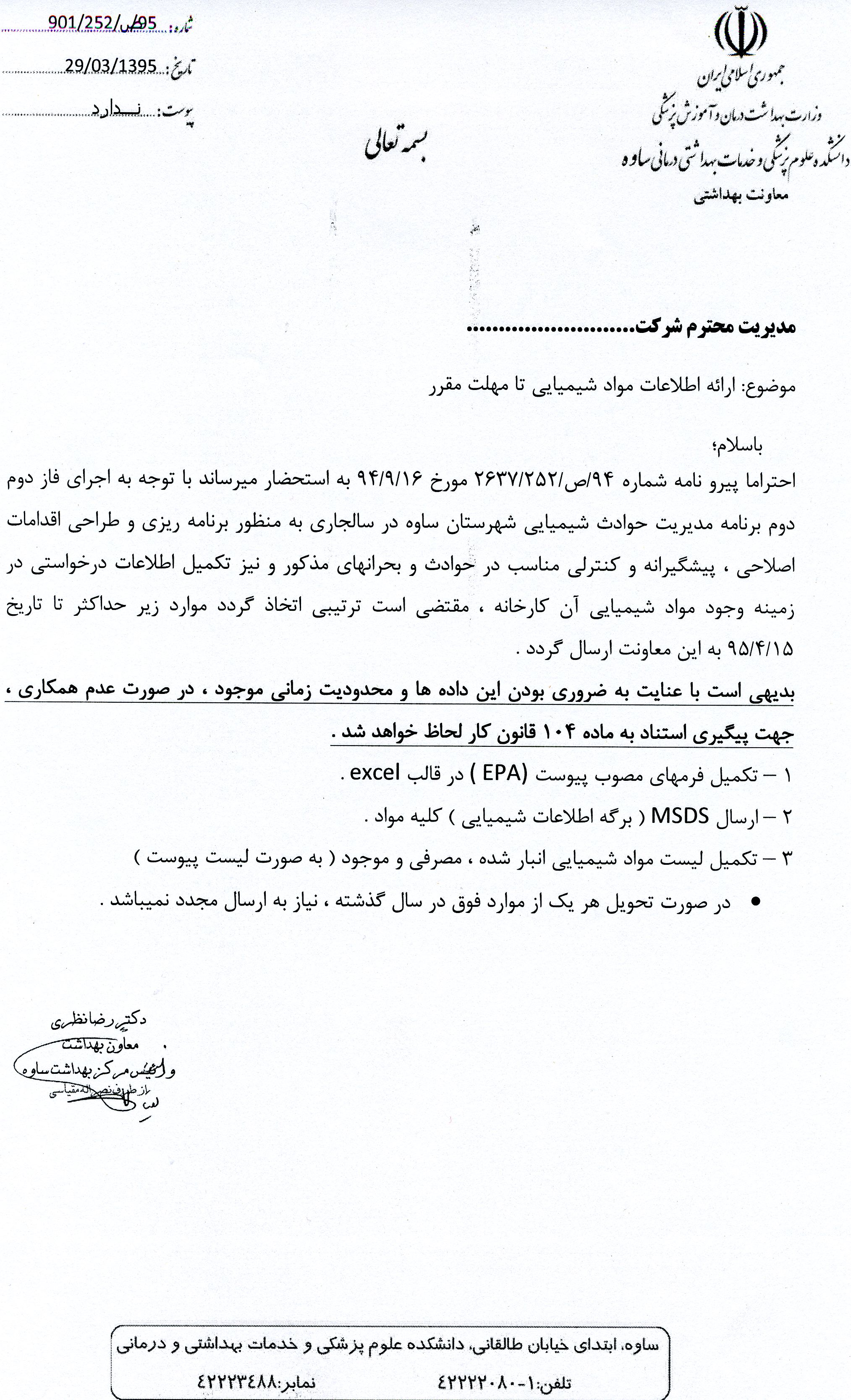 قابل توجه مسئولین بهداشت حرفه ای شاغل در صنایع شهرستان ساوه